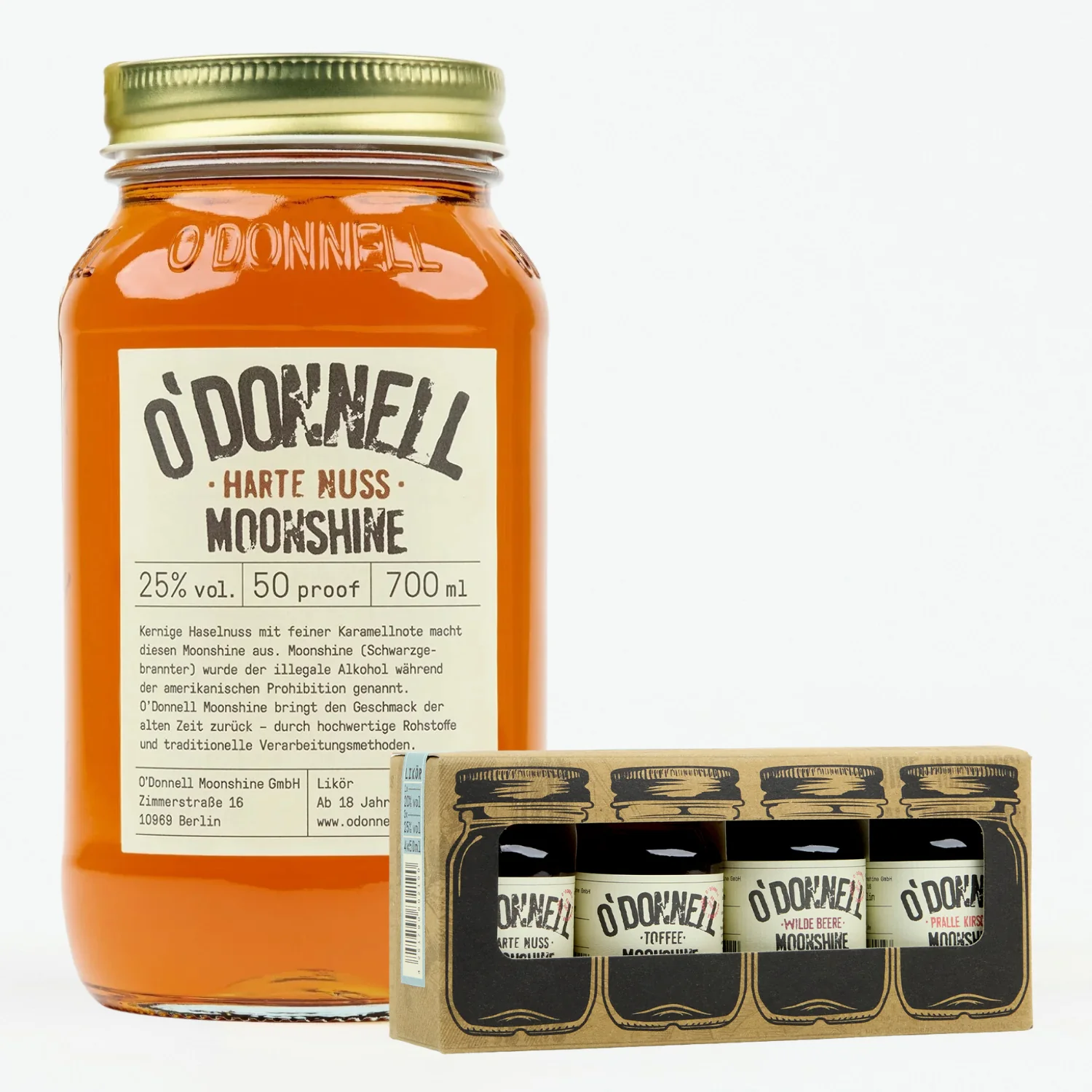 - Probieren & Genießen: Freu dich auf Mini O'Donnell Moonshine Shots und ein 700ml Mason Jar mit deiner Lieblingssorte.